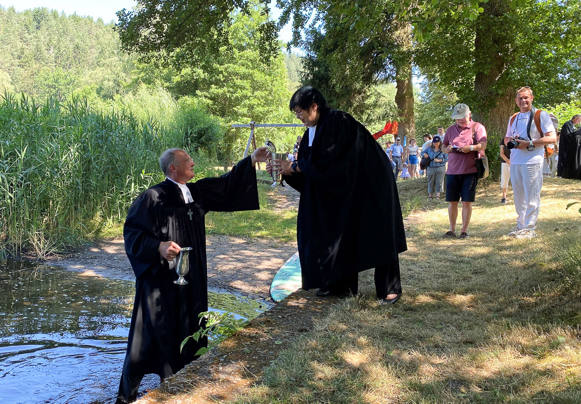 Insgesamt etwa 500 Besucherinnen und Besucher sowie 33 Täuflinge zählten mehrere Kirchengemeinden im Kirchenbezirk Kandel, die gemeinsam im Kaltenbach tauften. Auch die Gemeinden im Elmsteiner Tal baten ihre 22 Täuflinge ins kühle und lebendige Nass des Helmbachweihers. Ans Wasser, aber nicht ins Wasser ging es in Speyer. Die Kirchen der Pirmasenser Innenstadt luden in den Strecktalpark zum Picknickdecken-Gottesdienst mit Tauffest. Zwei Feste mit 33 Taufen stehen im Juli in Bad Dürkheim und Kapellen-Drusweiler an.