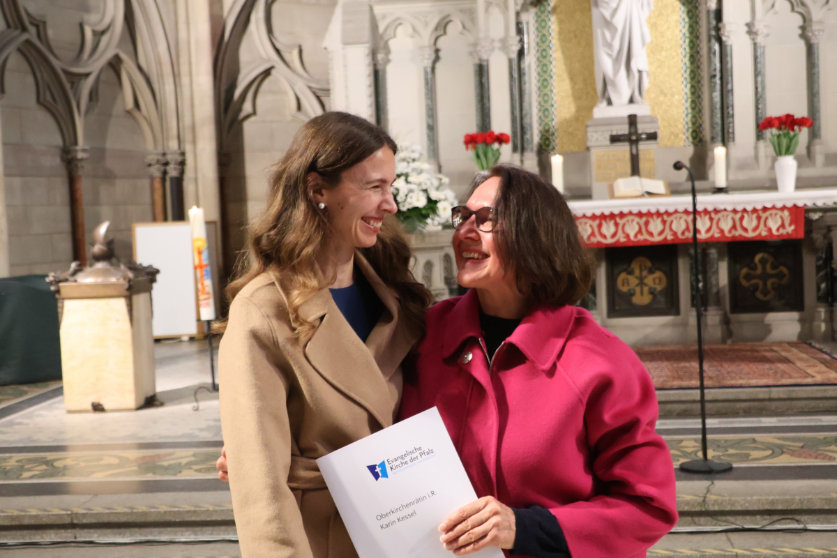 Speyer. Der Personalwechsel im Bau- und Finanzdezernat der Landeskirche ist vollzogen: Oberkirchenrätin in Ruhe Karin Kessel wurde bei einem Festgottesdienst in der Speyerer Gedächtniskirche offiziell in den Ruhestand verabschiedet. Ihre Nachfolgerin, Oberkirchenrätin Juliane Danz, wurde von Kirchenpräsidentin Dorothee Wüst ins Amt eingeführt. Dekane*innen, Pfarrer*innen, Verwaltungsleiter*innen der Kirchenämter, Vertreter*innen der gemeindlichen Dienste sowie der benachbarten Landeskirchen wohnten dem Gottesdienst bei. Unter den Gästen auch der Vorsitzende der Pfarrvertretung, Thomas Jakubowski, der Beauftragte der Evangelischen Kirchen in Rheinland-Pfalz, Kirchenrat Wolfgang Schumacher sowie die emeritierten Kirchenpräsidenten Eberhard Cherdron und Christian Schad. Die musikalische Gestaltung lag in den Händen von Kirchenmusikdirektor Robert Sattelberger und dem Posaunenchor Speyer unter der Leitung von Philipp Neidig.